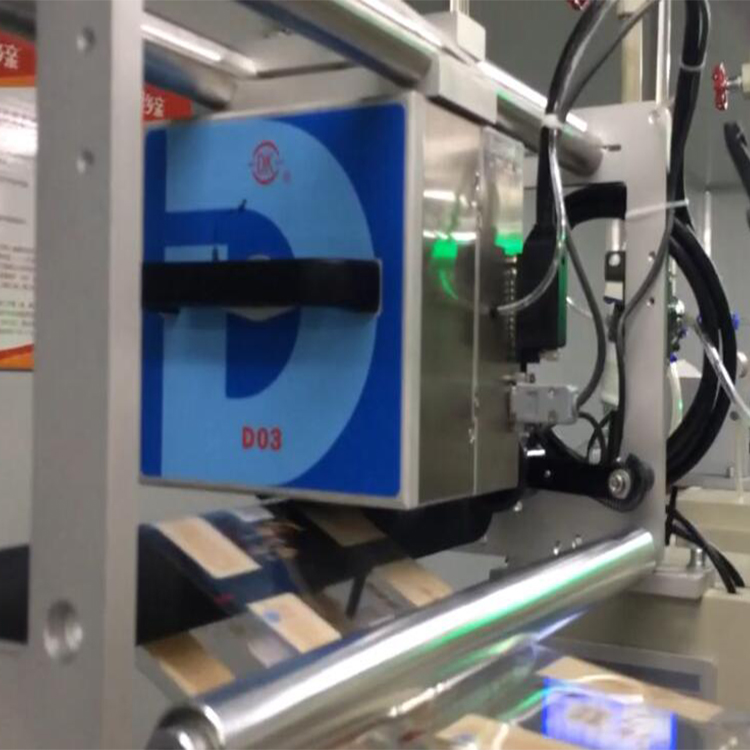 打碼時,打印頭與包裝膜有一個相對運動,在連續(xù)式包裝機上,包裝膜運行時 ,打印頭快速地壓在包裝膜上,打印出內容。完成一次動作后自動彈起復位,準備打下一袋。