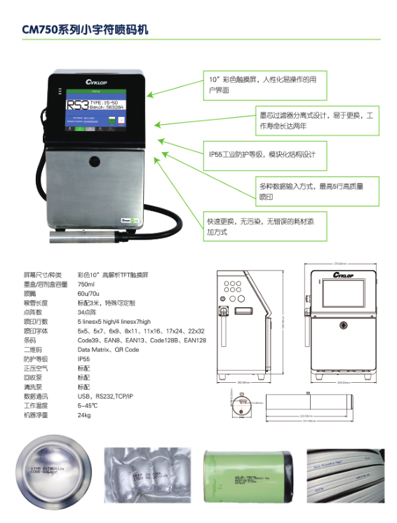 德國(guó)賽克集團(tuán)是全球領(lǐng)先的包裝機(jī)械設(shè)備和材料的供應(yīng)商之一,總部位于德國(guó)科隆,迄今已有一百多年的歷史。公司最新研發(fā)的CM750小字符噴碼機(jī)旨在高頻率的生產(chǎn)環(huán)境中,滿足客戶非常嚴(yán)苛的標(biāo)準(zhǔn)和多種多樣的噴印需求。在復(fù)雜環(huán)境下的可靠運(yùn)行,高質(zhì)量的噴印控制,使每個(gè)字符都趨完美:清晰易讀的10寸觸摸屏,帶來(lái)簡(jiǎn)單易用的設(shè)置、維護(hù)和操作:部件可單獨(dú)更換和落劑節(jié)省系統(tǒng),大大節(jié)省成本:強(qiáng)大和靈活的多種數(shù)據(jù)噴印功能,擴(kuò)展能力強(qiáng)。